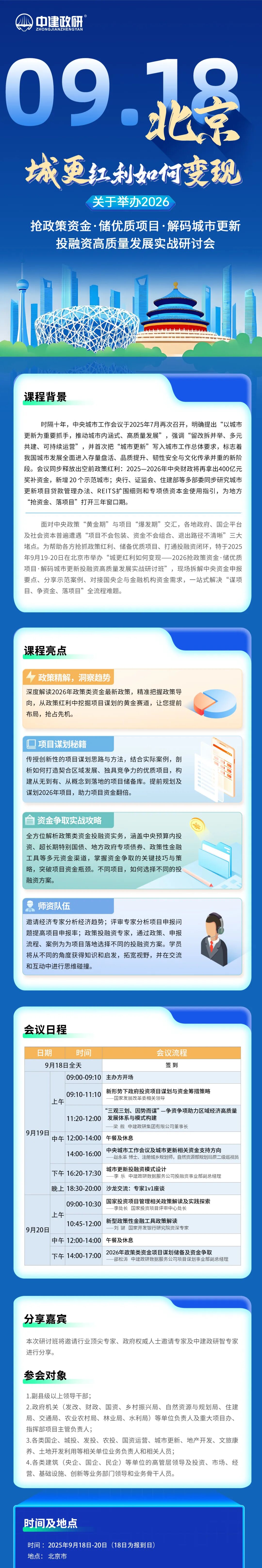 在城市更新的过程中,需要各方共同努力,作为投资建设领域集成服务运营商,中建政研可依托事业单位资源,汇聚行业头部专家与部委智囊,为帮助各地抢抓政策红利抢占项目先机破解城市更新资金难题,对此,中建政研将9月19-20日在北京市举办城更红利如何变现2026抢政策资金·储优质项目·解码城市更新投融资高质量发展实战研讨班,帮助各地充分发挥优势,推动城市更新工作取得更大的成效,实现城市的可持续发展