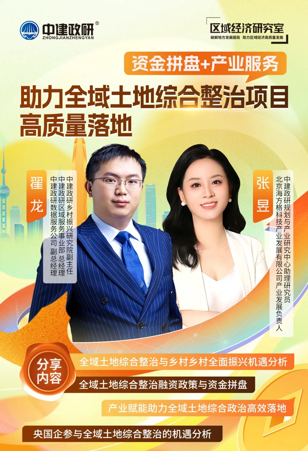 编者按全域土地综合整治是衔接乡村全面振兴的关键抓手,但项目推进时,您是否常面临这些难题:政策机遇如何精准把握?多元资金如何有效整合?产业赋能怎样落地见效?央国企又该如何把握参与契机?对此,2025年9月23日,中建政研数据服务公司副总经理中建政研区域服务事业部总经理中建政研乡村振兴研究院副主任翟龙和北京海方格科技产业发展有限公司产业发展负责人中建政研规划与产业研究中心助理研究员张昱以资金拼盘+产业服务:助力全域土地综合整治项目高质量落地为主题进行了分享
