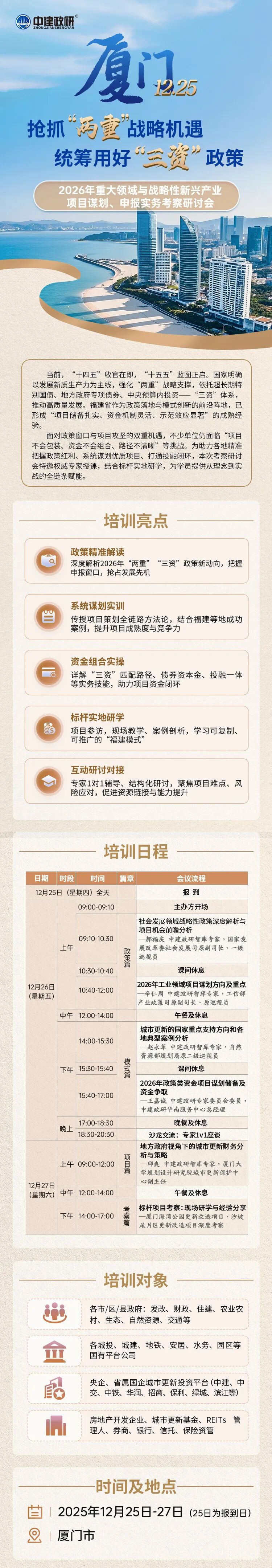 为帮助相关单位抢抓政策红利储备优质项目打通投融资闭环,特于12月25日在厦门举办抢抓两重战略机遇,统筹用好三资政策2026年重大领域与战略性新兴产业项目谋划申报实务考察班,届时将邀请知名专家授课,组织走进标杆企业考察,开展深度交流学习