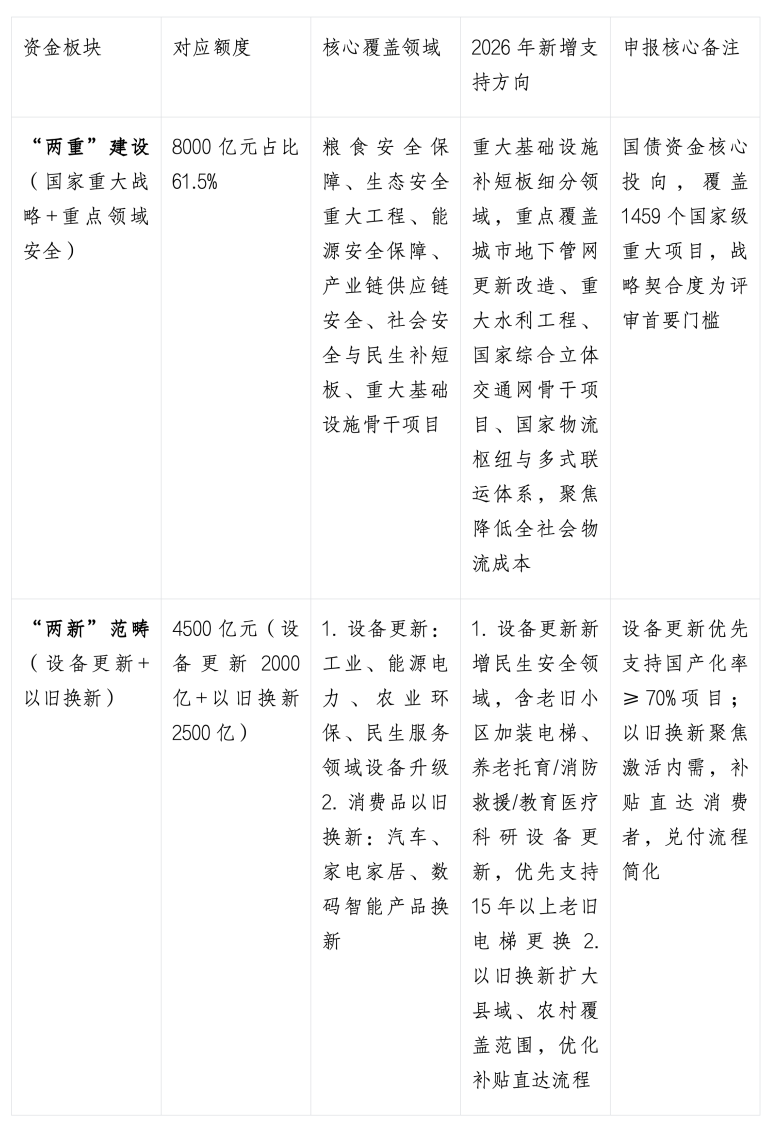 结合1.3万亿超长期特别国债整体分配方案,针对两重两新两大核心板块,细分投向资金额度2026年新增领域及申报核心要求全部整理为下表,层级清晰重点突出,方便快速对标申报方向,规避投向偏差: