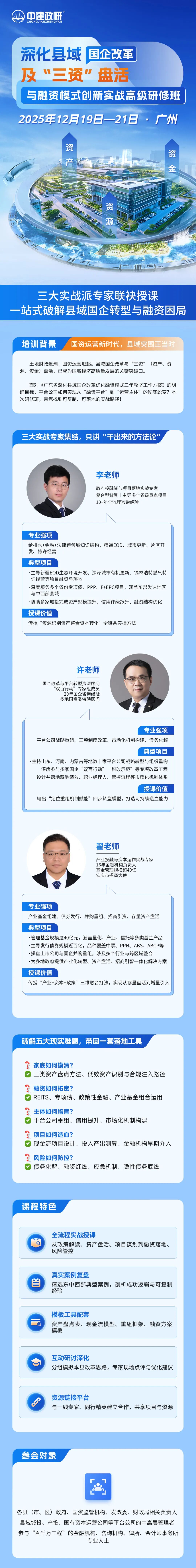 土地财政退潮,国资运营崛起县域国企改革与三资(资产资源资金)盘活,已成为区域经济高质量发展的关键突破口面对广东省深化县域国企改革优化融资模式三年攻坚工作方案的明确目标,平台公司如何实现从融资平台到运营主体的彻底蜕变?为此,中建政研将于12月19日- 21日在广州市举办深化县域国企改革及三资盘活与融资模式创新实战高级研修班
