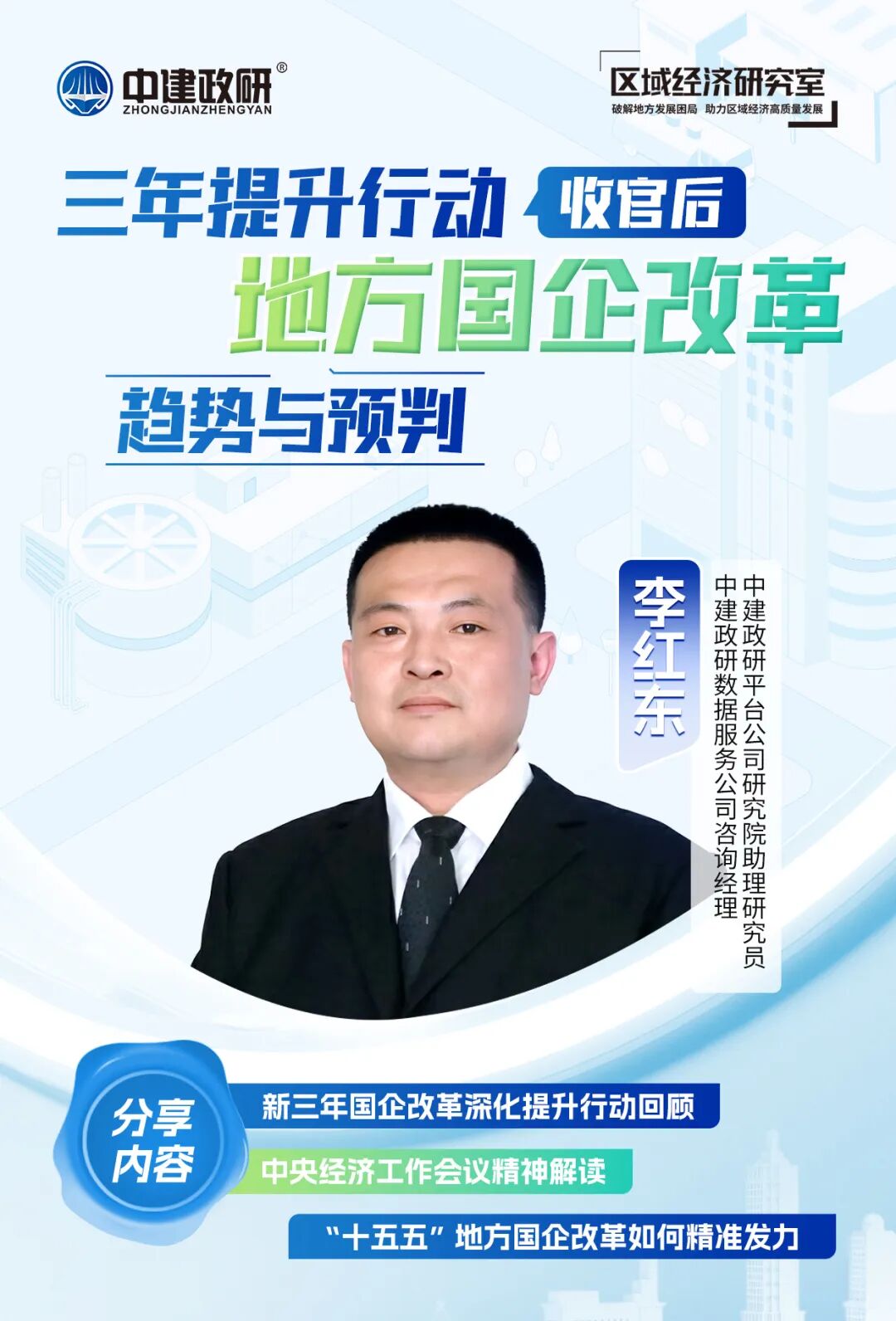 编者按自国有企业改革深化提升行动方案(20232025年)实施以来,地方国企改革在三年攻坚中取得阶段性成效,国资布局持续优化体制机制不断完善发展活力显著增强随着十五五开启的历史节点到来,中央经济工作会议为新一轮国企改革指明了方向对此,2025年12月18日,中建政研数据服务公司咨询经理中建政研平台公司研究院助理研究员李红东为我们带来三年提升行动收官后地方国企改革趋势与预判的主题分享