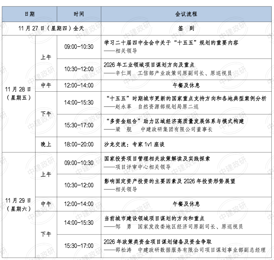 为帮助地方政府抢占十五五开局先机全面落实四中全会精神中建政研将于11月在北京举办抢占十五五战略先机:深入学习二十届四中全会精神2026年多领域项目申报与资金拼盘实战高级研讨班本次研讨班聚焦谋划申报融资落地全流程,系统解读十五五规划建议深度剖析2026年资金新政,分享实战案例对接多元资源,助力学员打通从国家战略到项目实施的最后一公里,真正实现用好政策盘活资金做实项目,在2026年资金竞争中赢得先手拔得头筹
