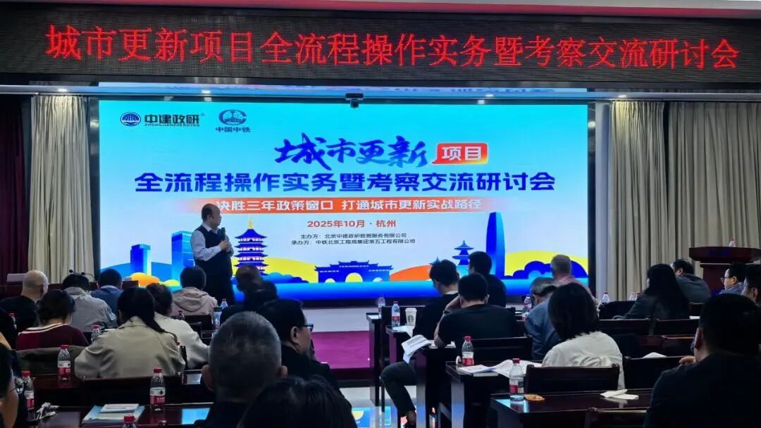 10月29日至31日,由北京中建政研数据服务有限公司与中建政研集团中铁北京工程局集团第五工程有限公司联合主办的城市更新项目全流程操作实务暨考察交流研讨会在浙江杭州萧山区经济技术开发区通惠北路2号成功举办本次会议紧扣2025年中央城市工作会议精神与浙江城市体检+城市更新双试点省优势,围绕城市更新项目谋划难融资难落地难三大痛点,汇聚相关政府及主管部门领导,杭州银行股份有限公司钱塘支行南京银行股份有限公司杭州分行中铁投资集团有限公司中冶置业集团有限公司山西园区建设发展集团有限公司中交一公局第八工程有限公司浙江省建投交通基础建设集团有限公司邢台市文化旅游发展集团有限公司等近100名央国企中高层领导干部,开展一场政策解读案例剖析模式创新与实地考察相结合的深度研讨,帮助各单位厘清政策脉络打通项目堵点提升实操能力,推动2026年城市更新项目有亮点有特色可落地